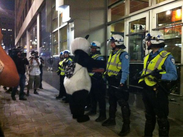 From the start of the strike, one of the main strategies of dismissal directed towards students has been infantilization, a targeted dilution of their status as full citizens in Quebec society. Students have been consistently characterized as “des enfants rois”, spoiled brats subject to a generational dismissal as overindulged, lazy, impractical and entitled. It’s time they paid their share, politicians and the sage pundits of the comments sections have repeatedly declared, ignoring the fact that a substantial percentage of students work (and pay taxes) while they study, and that the guidelines on parental contributions ignore the many students who receive little or no support from their families (not to mention the liminal status of mature students or graduate students, who fall outside of the age range that typically lends itself to the perception of hedonistic, latte drinking, iPhone toting youths). Like overgrown babies, students are dismissed as soft bodies, demanding, consumptive without the return of ‘real’ labour, and requiring a hard bodied, adult response from cops in riot gear and politicians who know how to draw and hold a line, even to absurdity. Let’s find these kids a job up north, Jean Charest famously joked, as students protested his plans for developing the national body to maximize profit through the Plan Nord. One subtext: these kids wouldn’t last five minutes if faced with real work. Given this, it might seem surprising that one of the most iconic, effective and popular figures to emerge out of the events of the last several months is a giant stuffed toutou known as Anarchopanda. If students are being characterized as big babies, isn’t it a bit counterproductive to embrace a giant adorable stuffy as a serious figure of their discontent? Actually, such détournements are exactly the effective territory of the students’ contagious actions.