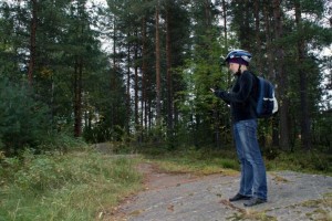 We executed multiple pilot eye-tracking tests in a forest environment with different tasks in different conditions. The eye-tracking system we used was iView X™ HED from SensoMotoric Instruments. This monocular system consists of an eye camera and a scene video camera which are attached to a bicycle helmet. The first tests were executed without a mobile phone. In that phase, the goal was to assess the feasibility of using an eye-tracking system in a forest environment and to pilot test task settings for future studies. During the tests, we took the users to the forest area to do simple navigation tasks. The tasks included, for example, walking through a certain route with a little guidance (no maps, paper or mobile applications were used), describing what he or she saw, describing how he or she located him/herself and describing the route in such a way that another person could follow it.