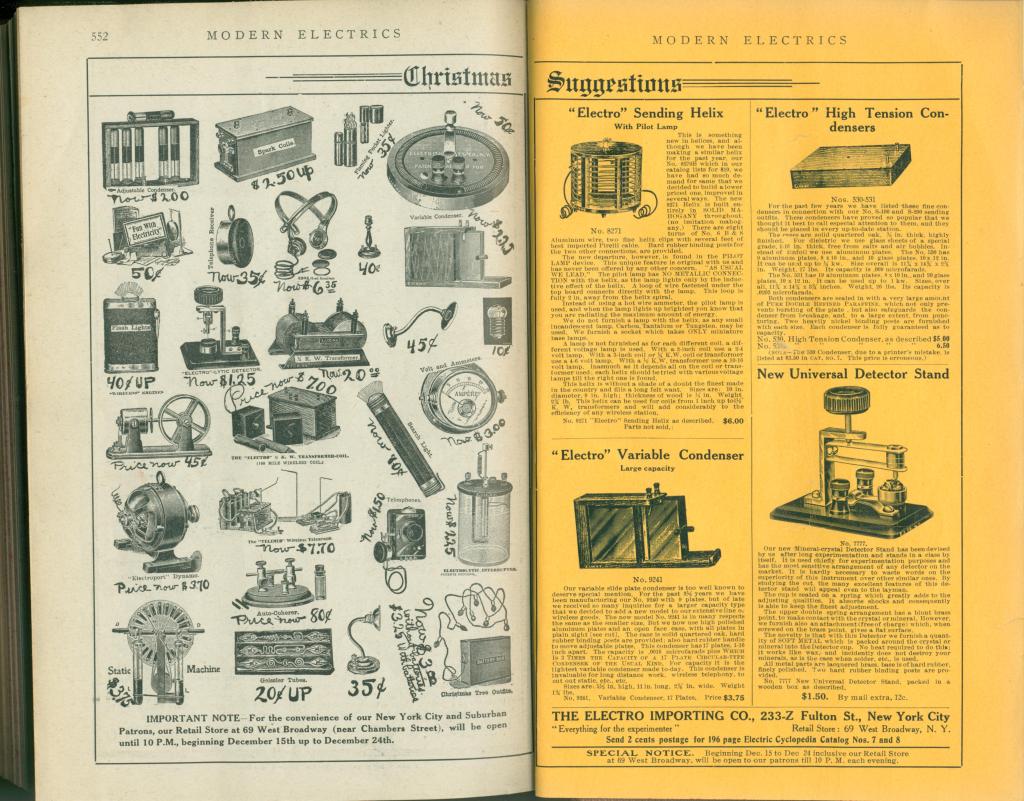 All of this began with the Electro Importing Catalog. After several issues of the mail order catalog and a growing subscription list, Electro Importing began including features, editorials, and letters to the editor. Between 1906 and 1910, the catalog grew into a series of monthly magazines for the wireless homebrewer, beginning with Modern Electrics in 1908 and the offshoot Experimenter Publishing Company in 1915. The transition from the mail-order catalog to the “slick paper” monthly magazine format was a smooth one, evidenced by the fact that the third edition (1908) of the Electro Importing catalog bears the title of the new full-format magazine, “Modern Electrics.”
