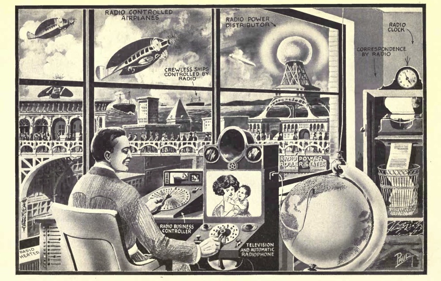 The medium that Gernsback attempts to name here is best understood as an early conceptualization of radio. While the voice had been transmitted wirelessly as early as 1900, most notably by the Canadian Reginald Fessenden, a reliable means for accurately sending sound, voice, and music signals was still a ways off. Because the broadcast model of radio we are familiar with today had yet to be imagined, most projections of wireless voice transmission involved a point-to-point model resembling a telephone conversation. “Aerophone” never took off as a name, and terms like “wireless telephone” and “radiophone” were gradually simplified to “wireless.”[3]