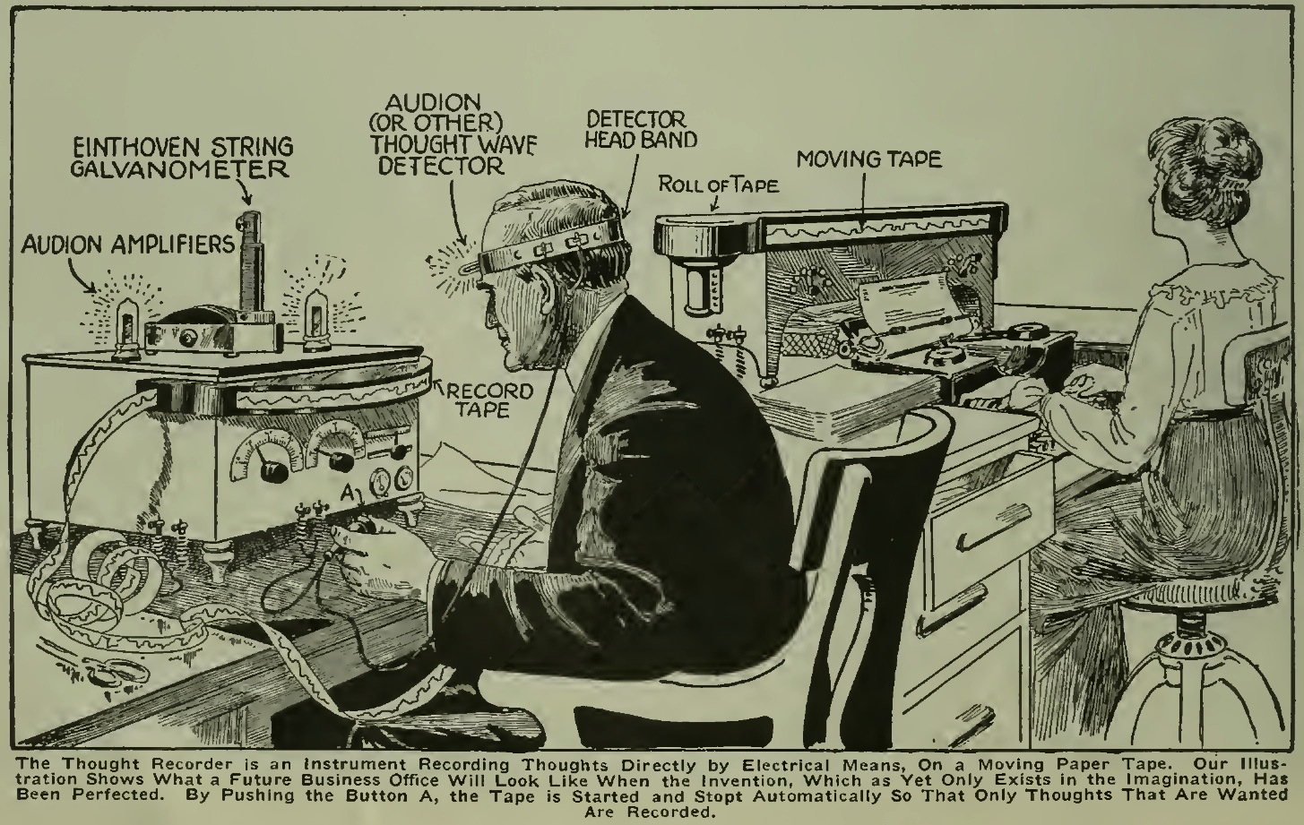 Instead of writing a letter, one sends the recorded Menotape, and inasmuch a the Menolphabet is universal and can be read by anyone—children being taught it early—it stands to reason that this invention was one of the greatest boons to humanity: Twenty times as much work can be done by means of the Menograph as could he done by the old-fashioned writing, which required a considerable physical effort. Typewriters disappeared soon after its invention, as there was no more use for them; nor was there any use for stenographers, as the thoughts were written down direct on the tape, which was sent out as a letter was sent centuries ago. (Gernsback (1911))