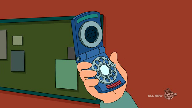 Yet, the most appealing aspect of Futurama’s vision of the future seems to be less the series’ connection to current technological developments but rather its obsession with the past. On the one hand, Futurama’s world contains typical science fiction icons like spaceships, robots, and futuristic megacities. On the other hand, most of the communication and entertainment devices appear strangely outdated: television sets are bulky CRT monitors, computers look a lot like their C64 and Atari ancestors, and many of the telephones still have a cord. With the exception of the eyePhone, mobile phones have much more in common with the communicators of the original Star Trek[5] series than with contemporary smartphones – or sometimes they look like bizarre hybrids like a clamshell phone with a dial plate.