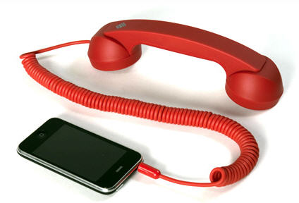 Three futuristic phones: Futurama’s clamshell phone, the iPhone dial plate app, and a retro handset.