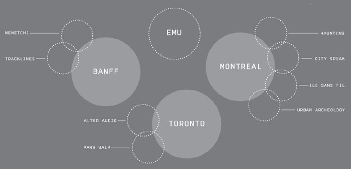 This map visually represents the disparate elements of the MDCN network. The Mobile Digital Commons Network is a national collaborative research network launched a year ago by the Banff New Media Institute and Concordia University. Situated in Banff, Toronto and Montreal the network is made up of designers, engineers, and communications scholars from a number of institutions that also includes the Ontario College of Art & Design and Concordia University. The MDCN explores the connections between human beings, urban and wilderness settings, and mobile technologies. By developing interactive mobile experiences and observing the dynamics inherent in wireless immersive environments, each of the MDCN projects that make up the network moves us closer to understanding how these technologies augment, enhance and transform our culturally situated experiences of urban and outdoor spaces.