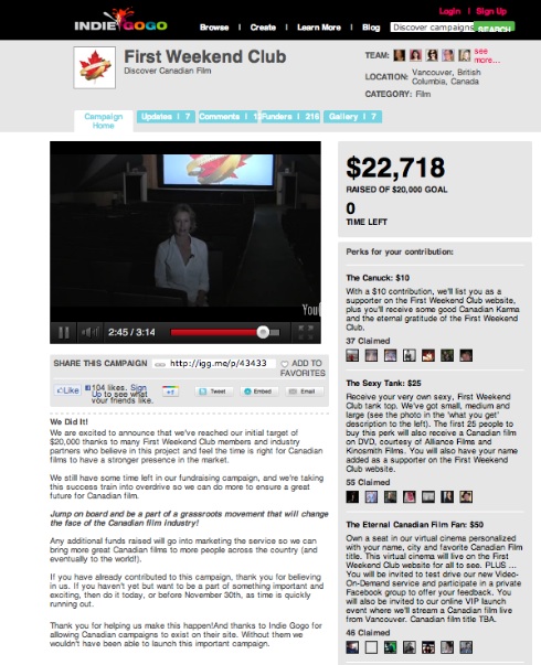 A comparative analysis between Kickstarter.com and Indiegogo.com suggests the importance of the artist, filmmaker, or project creator as a hub or node of activity. In particular, the financial and administrative mechanics used to generate a consistent approach and logistics on each site are revealing, as are the visual presentation and language. These mechanics include how each mobilizes the blog format, payment systems, and database structure. For non-Americans, there is an important difference between the sites: Kickstarter requires an American bank account, as well as evidence of American residency; Indiegogo does not. For Canadians, this can be a significant challenge, notwithstanding co-production histories and agreements between the two countries. The filmmakers I interviewed met the Kickstarter requirement in inventive ways. Conteh and Forsyth operate with an international producer team, while Littlefield secured the endorsement and support of an American foundation through which funding was channeled. Their determination to make use of Kickstarter is notable. As one filmmaker put it, “It’s like the difference between Coke and Pepsi… Coke is at 100% [desirability and market reach] and Pepsi is 70%” (Forsyth interview, 2011). Although Indiegogo correctly touts its international reach and ability to collect funds on behalf of projects around the world as an advantage in comparison to other crowdfunding websites and endeavours, it is still the case that all funds are secured in American dollars, and that participants are liable to American laws through participation on the website. For a specifically Canadian project like First Weekend Club’s video-on-demand service, the inability to contribute in Canadian dollars proved to be a significant deterrent to a few potential funders (Adams interview, 2011). For most participants, however, this is simply how business is conducted in a global cultural context.