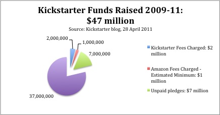 Note that Kickstarter published their success rate as 43% in April 2011, and as 46% in December 2011, based on the proportion of successful projects (7,496) to already-completed projects – extrapolated as 17,196 projects in 2011 (http://www.kickstarter.com/blog/happy-birthday-kickstarter, 28 April 2011; http://www.kickstarter.com/blog/2011-the-stats, 9 January 2012).22 However, Kickstarter aggregates “dollars pledged” to include “live” projects and “successful” projects, lifting “dollars raised” significantly, to $53,107,672 in April 2011; one million dollars (in total pledges to date) by one million backers by October 2011; and $99,344,382 for all of 2011 (http://www.kickstarter.com/blog/happy-birthday-kickstarter, 28 April 2011; http://www.kickstarter.com/blog/2011-the-stats, 9 January 2012). With a 37% success rate, almost two-thirds of pledged funding in current campaigns will never be redeemed; that is, the actual funds flowing to the projects is considerably lower. Even the most favourable self-published rate of 46% indicates that more than half the pledges received will not be redeemed. Though it is evident that a noteworthy amount of money is generated by crowdfunding, Kickstarter acknowledges lower redemptions: approximately 85% of the money pledged to date – for successful projects only – has been collected. At 85%, Kickstarter.com figures suggest that $40 million was redeemed in the first two years (versus $47 million pledged). Seven million dollars in unredeemed pledges, however, is a sizeable drop-off, especially in addition to administration fees of another 5% (of the total pledged) to Kickstarter, and between 3 and 5% of total redeemed pledges paid out in credit card fees to Amazon, suggesting actual funds flowing to projects was $37 million or 79%.
