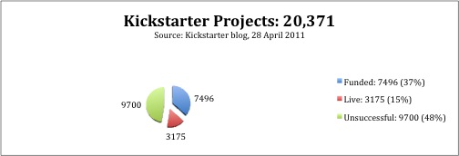 On the anniversary of their second year in operation (April 28, 2011) and at 2011 year-end (9 January 2012), Kickstarter.com published several participation and funding metrics that are useful for contextualizing the qualitative research I undertook, clarifying and augmenting the speculative and journalist estimates previously published about Kickstarter’s successes. These metrics provide an explicit quantification of how much funding circulates, while analysis of promotional materials and the composition of supporter assemblages suggest how and why value is created by the crowdfunding work. The most promoted of Kickstarter’s reported figures concerns successful projects: the blog now regularly summarizes data here. Of the 20,371 projects launched by April 28, 2011, some 37% or 7,496 had already been successfully funded. An additional 3,175 (15%) are “live projects,” which means projects currently raising funds. That leaves 9,700 projects (or 48%) that were unsuccessful.