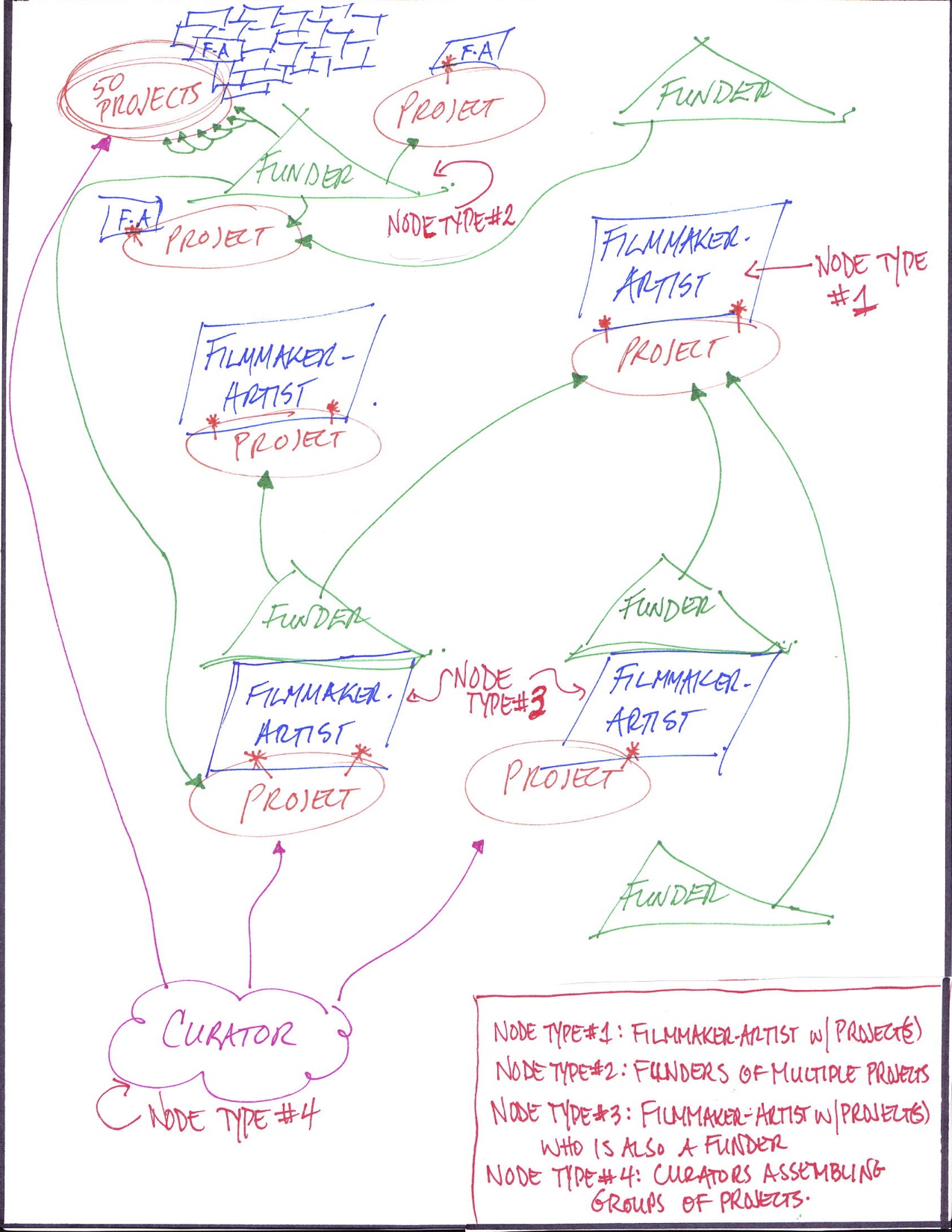 As discussed earlier, raising funding for filmmaking and other forms of media production is traditionally considered a producer’s responsibility. Likewise, investing in a project with no expectation of financial return is a patron’s prerogative. Are these individuals involved in a kind of creative stewardship, or civic contribution, that goes substantially beyond the funding contribution the virtual producer makes? Or is this a genuine hybrid? It seems that it might be. The virtual crowd which funds individual media and other projects sorts itself into temporary assemblages that become a stand-in collective patron as well as (virtual) producer, generating flexible trajectories of support. It makes sense to consider the funding assemblages as comprised of individuals displaying this specific hybrid function: virtual producer-patrons who generate and leverage funding activity for the sector. The composition of these mobile hubs of activity resembles and combines with the activity nodes of filmmakers and artists discussed earlier in the creation of value related to risk as well as to labour. Each type of node includes an individual who makes a series of deliberate decisions related to creative production and engagement, actions and interactions that repeat frequently in new combinations and permutations that can be systematically tracked and almost formulaically predicted into a series of assemblages connected by trajectories. In the preliminary schematic below, it is evident that there are at least four possible types of this activity. The four preliminary nodes and their linking trajectories can be represented this way: