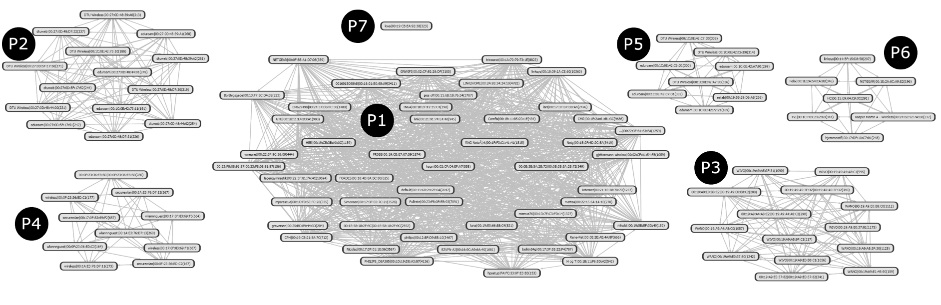 Fig. 2. Seven known places P1-P7 discovered for a participant by analyzing the co-occurrences of Wi-Fi access points over two weeks. Each node represents a unique Wi-Fi access point.