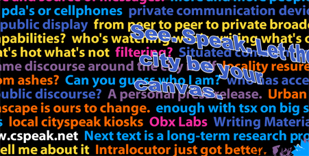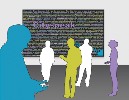 Cityspeak is a response to re-alignments in spatial power relations currently playing out in urban space. In North America, many city centers have shifted from public to semi-private spaces. Paul Virillio (Virillio, 1977), Rosalyn Deutsche (Deutsche, 1998) and urban theorist Stephen Graham and Simon Marvin observe this tendency to shift public interaction sites such as streets, parks, and plazas away from municipal control, to control by private and commercial interests.