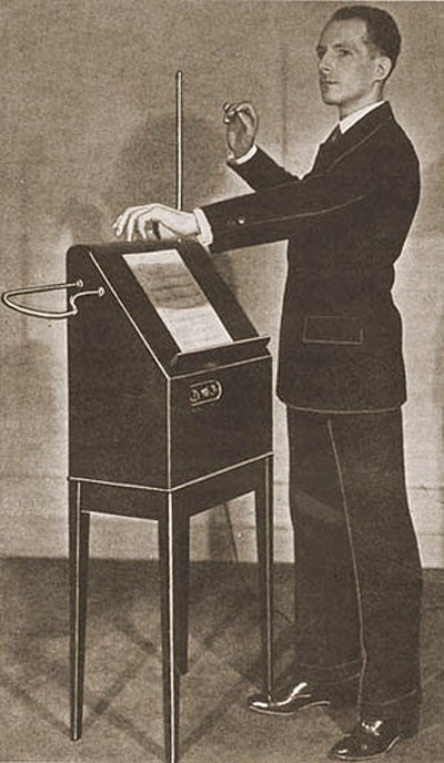 These experiments set the stage for Theremin’s development of a musical instrument: the etherphone, as he first called it, which became known as the thereminvox, and eventually simply the theremin. Natural body capacitance, this time just from the hand, interfered with the electromagnetic field emanating from the device, introducing a change to the capacitance of its circuit and thus altering the oscillating frequency. To make the instrument more sensitive, Theremin applied the heterodyne principle, in which two high frequencies are combined to produce a lower-frequency third, whose frequency is the difference between the first two. For instance, a frequency of 21,000 cycles per second combined with a frequency of 18,000 cycles per second “beats together” to produce an audible frequency at 3,000 cycles per second. For his nascent instrument, Theremin used two very high frequency fixed oscillators that each produced the same note far beyond human hearing, with one remaining fixed while the other was variable. The variable oscillator was attached to a weak antenna sticking vertically out of the box in which the circuit was built. When a human hand moved closer to the antenna, the body’s natural capacitance added more capacitance to the circuit, reducing the frequency of the variable oscillator to a pitch lower than the fixed one, so that the two frequencies ‘beat together’ to produce a pitch within the range of human hearing. Moving the hand to different distances from the antenna produced different beat frequencies: the closer the hand to the aerial, the higher the pitch; the further away, the lower the pitch, until the hand left the field of the circuit, returning the heterodyning function to the neutral status of zero (and as a result emitting no sound).