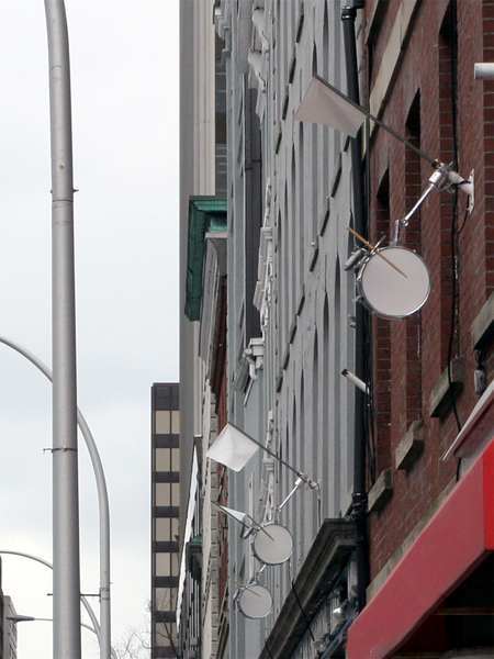 In a more recent outdoor sculptural intervention entitled Drum Line, Stephan merges standard technology used by the municipality with a few additional electronic components and a collection of identical snare drums. The municipality was kind enough to lend Stephan rubber hoses normally used for monitoring city traffic. The rubber hoses are directly connected to each of the shiny chrome snare drums which are hung from flag poles on a building’s facade. Each drum is equipped with a motorized drumstick.