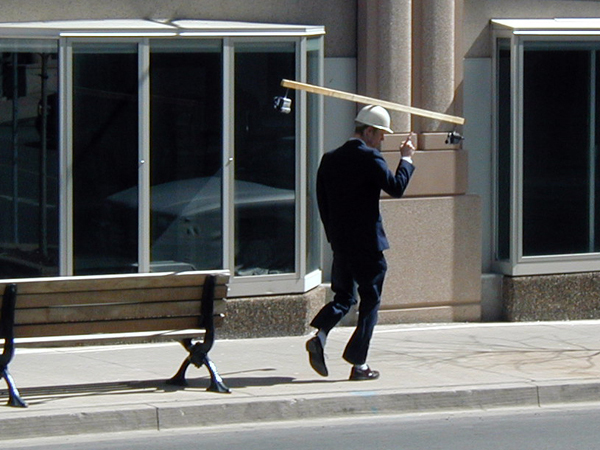I recently saw a man in a three-piece suit, walking confidently, wearing a white construction helmet that balanced an eight-foot plank of wood with two video cameras attached on either end. I wasn’t the only one to be baffled by the sight. It turned out that most people around me stopped in their tracks with puzzled but smiling faces and asked the same questions; “what is he doing? What’s going on?” From a distance I watched with another curious pedestrian and began a conversation. Together we tried to figure it out, had a good laugh and in the process we learned a little bit about each other.