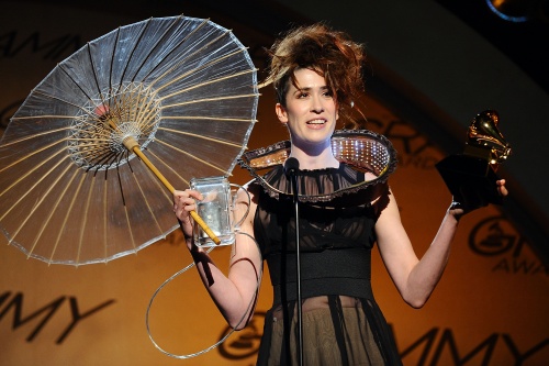 As with the earlier decision about the final version of “Tidal,” Ustream users were “with” Heap, in studio, as she contemplated the production and marketing challenges that she faced. By extending the space of her studio outward, she incorporated fans into her studio practices. If this were simply a call out on Twitter for help making a decision regarding different edits of a song, it would have been unremarkable. However, many of these fans had been involved in the process from its inception. They had seen the studio, in which the Ustream session took place, transformed from a basement family room into the useable and workable studio it now appears to be. They were familiar with the space and invested in Heap and her music. Her solicitation for opinions and advice was thus part of an ongoing process. During the making of Ellipse, whether through their comments to her videos and social media accounts, or through their direct contributions to the album and its packaging, fans took part in a co-creative relationship that revolved around the circulation of Heap’s music and her profile. Heap acknowledged the importance of this contribution by continually seeking additional ways involve listeners, users, and viewers in the production process. Perhaps the most fitting and final show of gratitude came when Heap attended the Grammy awards in 2010, at which she won “Best Engineered Album (Non Classical)” for the production of Ellipse. For the occasion, she created a “twitdress” with an electronic collar hooked up to her mobile phone that tweeted messages and pictures from fans as she walked around the gala and as she came up on stage to accept her award. Although fans, who had some part in the production of the album, could not physically be present at the Grammys, Heap saw the dress as a way for them to “accompany me on the red carpet” (Heap, quoted in Dybwad, 2010).